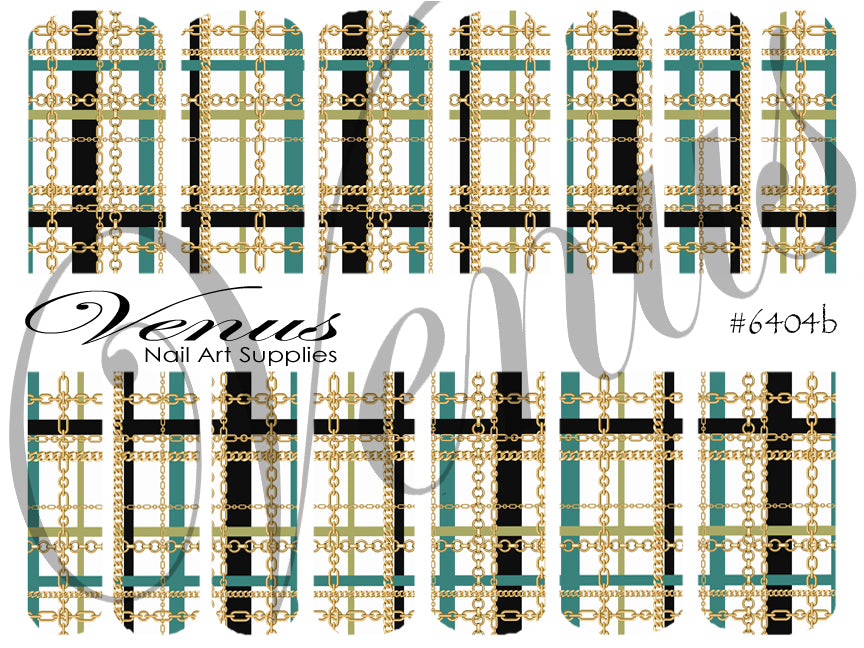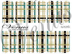 Nail Art Water Transfer Decals - Plaid Chains: Teal/Gold (Clear/White) #6404b